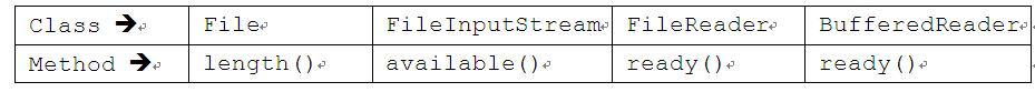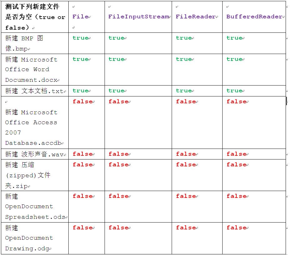 /** * Returns the length of the file denoted by this abstract pathname. * The return value is unspecified if this pathname denotes a directory. * * @return The length, in bytes, of the file denoted by this abstract * pathname, or <code>0L</code> if the file does not exist * * @throws SecurityException * If a security manager exists and its <code>{@link * java.lang.SecurityManager#checkRead(java.lang.String)}</code> * method denies read access to the file */ public long length() {SecurityManager security = System.getSecurityManager();if (security != null) { security.checkRead(path);}return fs.getLength(this); }publicclass FileInputStream extends InputStream{ /** * Returns the number of bytes that can be read from this file input * stream without blocking. * * @return the number of bytes that can be read from this file input * stream without blocking. * @exception IOException if an I/O error occurs. */public native int available() throws IOException;}public class InputStreamReader extends Reader {/** * Tell whether this stream is ready to be read. An InputStreamReader is * ready if its input buffer is not empty, or if bytes are available to be * read from the underlying byte stream. * * @exception IOException If an I/O error occurs */ public boolean ready() throws IOException {return sd.ready(); }}public class FileReader extends InputStreamReader {}public class BufferedReader extends Reader {/** * Tell whether this stream is ready to be read. A buffered character * stream is ready if the buffer is not empty, or if the underlying * character stream is ready. * * @exception IOException If an I/O error occurs */ public boolean ready() throws IOException {synchronized (lock) { ensureOpen(); /* * If newline needs to be skipped and the next char to be read * is a newline character, then just skip it right away. */ if (skipLF) {/* Note that in.ready() will return true if and only if the next * read on the stream will not block. */if (nextChar >= nChars && in.ready()) { fill();}if (nextChar < nChars) { if (cb[nextChar] == '\n') nextChar++; skipLF = false;} } return (nextChar < nChars) || in.ready();}}}package my.tool.file.util;import java.io.BufferedReader;import java.io.File;import java.io.FileInputStream;import java.io.FileNotFoundException;import java.io.FileReader;import java.io.IOException;public class EmptyFileChecker {public static boolean isFileEmpty1(File file) {FileInputStream fis = null;boolean flag = true;try {fis = new FileInputStream(file);if (fis.available() != 0) {flag = false;}} catch (FileNotFoundException e) {// TODO Auto-generated catch blocke.printStackTrace();} catch (IOException e) {// TODO Auto-generated catch blocke.printStackTrace();} finally {if (null != fis) {try {fis.close();} catch (IOException e) {// TODO Auto-generated catch blocke.printStackTrace();} finally {fis = null;}}}return flag;}public static boolean isFileEmpty2(File file) {boolean flag = true;FileReader fr = null;try {fr = new FileReader(file);if (fr.ready()) {flag = false;}} catch (FileNotFoundException e) {// TODO Auto-generated catch blocke.printStackTrace();} catch (IOException e) {// TODO Auto-generated catch blocke.printStackTrace();} finally {if (null != fr) {try {fr.close();} catch (IOException e) {// TODO Auto-generated catch blocke.printStackTrace();} finally {fr = null;}}}return flag;}public static boolean isFileEmpty3(File file) {boolean flag = true;BufferedReader br = null;try {br = new BufferedReader(new FileReader(file));if (br.ready()) {flag = false;}} catch (FileNotFoundException e) {// TODO Auto-generated catch blocke.printStackTrace();} catch (IOException e) {// TODO Auto-generated catch blocke.printStackTrace();} finally {if (null != br) {try {br.close();} catch (IOException e) {// TODO Auto-generated catch blocke.printStackTrace();} finally {br = null;}}}return flag;}public static boolean isFileEmpty4(File file) {return file.length() ==0L;} }