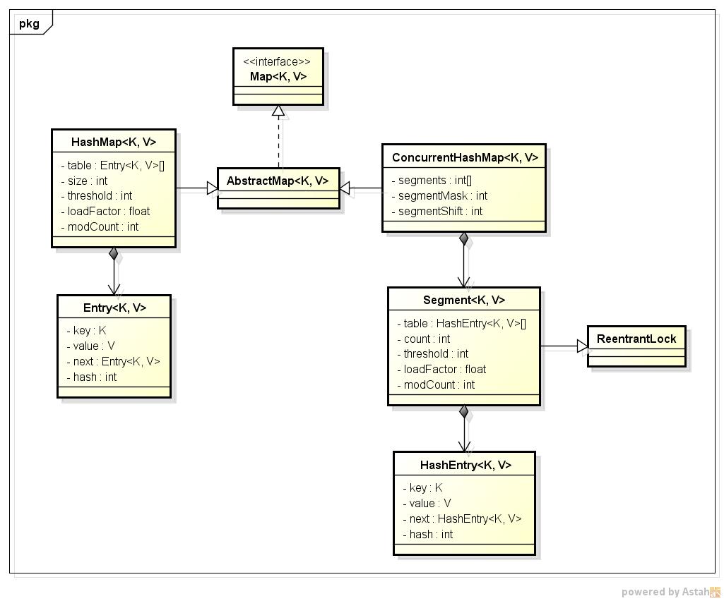 从类图中可以看出来在存储结构中ConcurrentHashMap比HashMap多出了一个类Segment,而Segment是一个可重入锁。