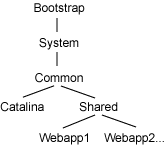 作为类装入器层次结构的实际示例,图 1 显示了 Tomcat servlet 引擎定义的类装入器层次结构。这里 Common 类装入器从 Tomcat 安装的某个特定目录的 JAR 文件进行装入,旨在用于在服务器和所有 Web 应用程序之间共享代码。Catalina 装入器用于装入 Tomcat 自己的类,而 Shared 装入器用于装入 Web 应用程序之间共享的类。最后,每个 Web 应用程序有自己的装入器用于其私有类。