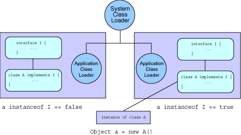 使用多个类装入器还可能引起其它类型的混淆。图 2 显示了 类身份危机(class identity crisis)的示例,它是在两个独立类装入器都装入一个接口及其相关的实现时产生的危机。即使接口和类的名称和二进制实现都相同,但是来自一个装入器的类的实例不能被认为是实现了来自另一个装入器的接口。图 2 中通过将接口类 I 移至 System 类装入器的空间就可以解除这种混淆。类 A 仍然有两个独立的实例,但它们都实现了同一个接口 I 。