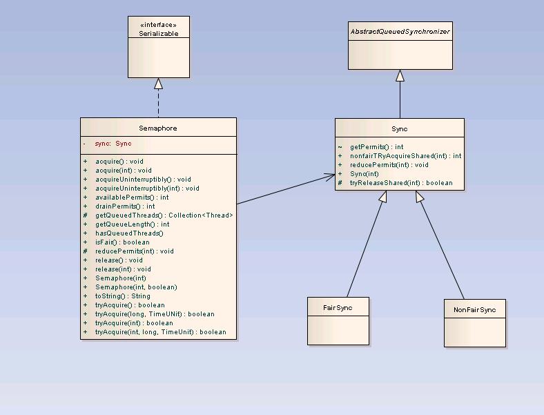 /* * @(#)Semaphore.java1.8 04/07/12 * * Copyright 2004 Sun Microsystems, Inc. All rights reserved. * SUN PROPRIETARY/CONFIDENTIAL. Use is subject to license terms. */package java.util.concurrent;import java.util.*;import java.util.concurrent.locks.*;import java.util.concurrent.atomic.*;/** * A counting semaphore. Conceptually, a semaphore maintains a set of * permits. Each {@link #acquire} blocks if necessary until a permit is * available, and then takes it. Each {@link #release} adds a permit, * potentially releasing a blocking acquirer. * However, no actual permit objects are used; the <tt>Semaphore</tt> just * keeps a count of the number available and acts accordingly. * * <p>Semaphores are often used to restrict the number of threads than can * access some (physical or logical) resource. For example, here is * a class that uses a semaphore to control access to a pool of items: * <pre> * class Pool { * private static final MAX_AVAILABLE = 100; * private final Semaphore available = new Semaphore(MAX_AVAILABLE, true); * * public Object getItem() throws InterruptedException { * available.acquire(); * return getNextAvailableItem(); * } * * public void putItem(Object x) { * if (markAsUnused(x)) * available.release(); * } * * // Not a particularly efficient data structure; just for demo * * protected Object[] items = ... whatever kinds of items being managed * protected boolean[] used = new boolean[MAX_AVAILABLE]; * * protected synchronized Object getNextAvailableItem() { * for (int i = 0; i < MAX_AVAILABLE; ++i) { * if (!used[i]) { * used[i] = true; * return items[i]; * } * } * return null; // not reached * } * * protected synchronized boolean markAsUnused(Object item) { * for (int i = 0; i < MAX_AVAILABLE; ++i) { * if (item == items[i]) { * if (used[i]) { * used[i] = false; * return true; * } else * return false; * } * } * return false; * } * * } * </pre> * * <p>Before obtaining an item each thread must acquire a permit from * the semaphore, guaranteeing that an item is available for use. When * the thread has finished with the item it is returned back to the * pool and a permit is returned to the semaphore, allowing another * thread to acquire that item. Note that no synchronization lock is * held when {@link #acquire} is called as that would prevent an item * from being returned to the pool. The semaphore encapsulates the * synchronization needed to restrict access to the pool, separately * from any synchronization needed to maintain the consistency of the * pool itself. * * <p>A semaphore initialized to one, and which is used such that it * only has at most one permit available, can serve as a mutual * exclusion lock. This is more commonly known as a [i]binary * semaphore[/i], because it only has two states: one permit * available, or zero permits available. When used in this way, the * binary semaphore has the property (unlike many {@link Lock} * implementations), that the "lock" can be released by a * thread other than the owner (as semaphores have no notion of * ownership). This can be useful in some specialized contexts, such * as deadlock recovery. * * <p> The constructor for this class optionally accepts a * [i]fairness[/i] parameter. When set false, this class makes no * guarantees about the order in which threads acquire permits. In * particular, [i]barging[/i] is permitted, that is, a thread * invoking {@link #acquire} can be allocated a permit ahead of a * thread that has been waiting - logically the new thread places itself at * the head of the queue of waiting threads. When fairness is set true, the * semaphore guarantees that threads invoking any of the {@link * #acquire() acquire} methods are selected to obtain permits in the order in * which their invocation of those methods was processed * (first-in-first-out; FIFO). Note that FIFO ordering necessarily * applies to specific internal points of execution within these * methods. So, it is possible for one thread to invoke * <tt>acquire</tt> before another, but reach the ordering point after * the other, and similarly upon return from the method. * Also note that the untimed {@link #tryAcquire() tryAcquire} methods do not * honor the fairness setting, but will take any permits that are * available. * * <p>Generally, semaphores used to control resource access should be * initialized as fair, to ensure that no thread is starved out from * accessing a resource. When using semaphores for other kinds of * synchronization control, the throughput advantages of non-fair * ordering often outweigh fairness considerations. * * <p>This class also provides convenience methods to {@link * #acquire(int) acquire} and {@link #release(int) release} multiple * permits at a time. Beware of the increased risk of indefinite * postponement when these methods are used without fairness set true. * * @since 1.5 * @author Doug Lea * */public class Semaphore implements java.io.Serializable { private static final long serialVersionUID = -3222578661600680210L; /** All mechanics via AbstractQueuedSynchronizer subclass */ private final Sync sync; /** * Synchronization implementation for semaphore. Uses AQS state * to represent permits. Subclassed into fair and nonfair * versions. */ abstract static class Sync extends AbstractQueuedSynchronizer { Sync(int permits) { setState(permits); } final int getPermits() { return getState(); } final int nonfairTryAcquireShared(int acquires) { for (;;) { int available = getState(); int remaining = available - acquires; if (remaining < 0 || compareAndSetState(available, remaining)) return remaining; } } protected final boolean tryReleaseShared(int releases) { for (;;) { int p = getState(); if (compareAndSetState(p, p + releases)) return true; } } final void reducePermits(int reductions) { for (;;) { int current = getState(); int next = current - reductions; if (compareAndSetState(current, next)) return; } } final int drainPermits() { for (;;) { int current = getState(); if (current == 0 || compareAndSetState(current, 0)