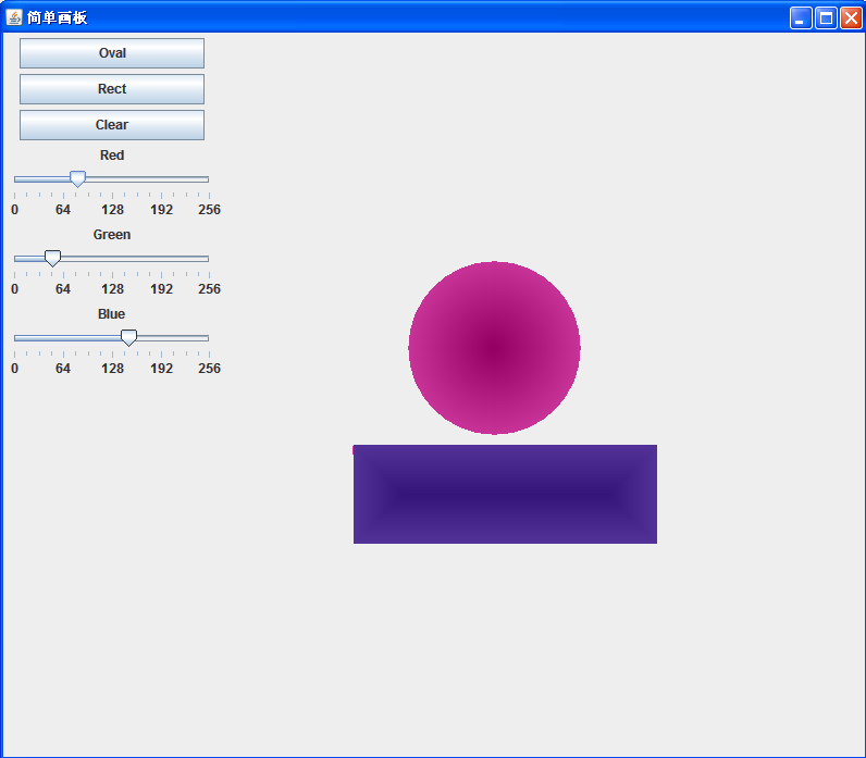 import java.awt.BorderLayout;import java.awt.Dimension;import java.awt.FlowLayout;import java.awt.Graphics;import javax.swing.JButton;import javax.swing.JFrame;import javax.swing.JLabel;import javax.swing.JPanel;import javax.swing.JSlider;/** * 简单画板,实现画线,画圆,画矩形,清除痕迹,颜色选择功能 */public class SimplePanel extends JFrame{public Graphics g;public JPanel jpChose;//按钮选择面板public JPanel jpDraw;//画图面板public JButton jOval;//渐变圆public JButton jRect;//渐变矩形public JButton jClear;//自定义橡皮擦public JLabel red;//标签 红色public JLabel green;//标签 绿色public JLabel blue;//标签 蓝色public JSlider jRed;//滑杆 红色public JSlider jBlue;//滑杆 蓝色public JSlider jGreen;//滑杆 绿色public static void main(String args[]){SimplePanel sp = new SimplePanel();sp.init();}/** * 初始化面板类 */public void init(){//设置面板属性this.setTitle("简单画板");this.setSize(800, 700);this.setDefaultCloseOperation(3);this.setLocationRelativeTo(null);//设置边框布局this.setLayout(new BorderLayout());/*-----------------选择面板.西边----------------------*/jpChose = new JPanel();jpChose.setPreferredSize(new Dimension(200,700));jpChose.setLayout(new FlowLayout());jOval = new JButton("Oval");jRect = new JButton("Rect");jClear = new JButton("Clear");jOval.setPreferredSize(new Dimension(170,28));jRect.setPreferredSize(new Dimension(170,28));jClear.setPreferredSize(new Dimension(170,28));red = new JLabel("Red");green = new JLabel("Green");blue = new JLabel("Blue");jRed = new JSlider();jGreen = new JSlider();jBlue = new JSlider();//设置滑杆的各种属性this.setSlider();//向面板添加按钮jpChose.add(jOval);jpChose.add(jRect);jpChose.add(jClear);//向面板添加标签和滑杆jpChose.add(red);jpChose.add(jRed);jpChose.add(green);jpChose.add(jGreen);jpChose.add(blue);jpChose.add(jBlue);//添加动作监听器,获得按钮文本ButtonL bl = new ButtonL();jOval.addActionListener(bl);jRect.addActionListener(bl);jClear.addActionListener(bl);this.add(jpChose, BorderLayout.WEST);/*-----------------选择面板.西边----------------------*//*-----------------绘图面板.中央----------------------*/jpDraw = new JPanel();this.add(jpDraw, BorderLayout.CENTER);/*-----------------绘图面板.中央----------------------*/this.setVisible(true);g = jpDraw.getGraphics();//鼠标监听器,根据鼠标起始位置画图形MouseL ml = new MouseL(g,jRed,jGreen,jBlue);jpDraw.addMouseListener(ml);//ChangeListener当移动滑杆上的滑块时,刚画过图形的颜色动态改变SliderL sl = new SliderL(g,jRed,jGreen,jBlue,ml);jRed.addChangeListener(sl);jGreen.addChangeListener(sl);jBlue.addChangeListener(sl);}/** * 设置滑杆属性方法 */private void setSlider() {//红jRed.setMaximum(256);//设置最大值jRed.setMajorTickSpacing(64);//设置主刻度标记的间隔jRed.setMinorTickSpacing(16);//设置次刻度标记的间隔jRed.setPaintLabels(true);//确定是否在滑块上绘制标签jRed.setPaintTicks(true);// 确定是否在滑块上绘制刻度标记jRed.setValue(120);//设置初始值//绿jGreen.setMaximum(256);jGreen.setMajorTickSpacing(64);jGreen.setMinorTickSpacing(16);jGreen.setPaintLabels(true);jGreen.setPaintTicks(true);jGreen.setValue(130);//蓝jBlue.setMaximum(256);jBlue.setMajorTickSpacing(64);jBlue.setMinorTickSpacing(16);jBlue.setPaintLabels(true);jBlue.setPaintTicks(true);jBlue.setValue(150);}} import java.awt.event.ActionEvent;import java.awt.event.ActionListener;/** * 用来获得按钮上文本的类,也可以写为内部类 */public class ButtonL implements ActionListener{public static String s="null";public void actionPerformed(ActionEvent e) {s = e.getActionCommand();}}import java.awt.Color;import java.awt.Graphics;import java.awt.event.MouseEvent;import java.awt.event.MouseListener;import javax.swing.JSlider;/** * 鼠标监听器,实现图形的绘制 */public class MouseL implements MouseListener {Graphics g;public int x1, y1, x2, y2;public JSlider jRed;public JSlider jBlue;public JSlider jGreen;public int red;public int green;public int blue;/** * 重载构造方法 * @param g画布,用来绘图 * @param jRed滑杆,用来获得颜色初始值 * @param jBlue滑杆,用来获得颜色初始值 * @param jGreen滑杆,用来获得颜色初始值 */public MouseL(Graphics g, JSlider jRed, JSlider jGreen, JSlider jBlue) {this.g = g;this.jRed = jRed;this.jGreen = jGreen;this.jBlue = jBlue;}/** * 按下鼠标,获得按下点的坐标并设置颜色为滑杆的初始颜色 */public void mousePressed(MouseEvent e) {x1 = e.getX();y1 = e.getY();red = jRed.getValue();green = jGreen.getValue();blue = jBlue.getValue();g.setColor(new Color(red, green, blue));}/** * 鼠标释放时,获取释放点的坐标,根据按钮的文本画出相应的图形 */public void mouseReleased(MouseEvent e) {x2 = e.getX();y2 = e.getY();String str = ButtonL.s;if (str.equals("Clear")) {g.clearRect(x1, y1, x2 - x1, y2 - y1);}//在这里采用的是向图形中心渐变的方法,也可以改变调用画图方法是传入的参数,实现更多种的变幻for (int i = 0; i < 150; i+=3) {if (str.equals("Oval")) {//画渐变圆g.fillOval(x1 + i, y1 + i, x2 - x1 - i*2, y2 - y1 - i*2);} else if (str.equals("Rect")) {//画渐变矩形g.fillRect(x1 + i, y1 + i, x2 - x1 - i*2, y2 - y1 - i*2);} red = red - 2;green-=2;blue-=2;g.setColor(new Color(red,green,blue));}}public void mouseClicked(MouseEvent e) {}public void mouseEntered(MouseEvent e) {}public void mouseExited(MouseEvent e) {}}import java.awt.Color;import java.awt.Graphics;import javax.swing.JSlider;import javax.swing.event.ChangeEvent;import javax.swing.event.ChangeListener;/** * 加在滑杆上的监听器,当任意滑杆上的滑块移动时,在先前画图形的位置用改变后的颜色将图形重画 */public class SliderL implements ChangeListener{public Graphics g;public JSlider jRed;public JSlider jBlue;public JSlider jGreen;public int red;public int green;public