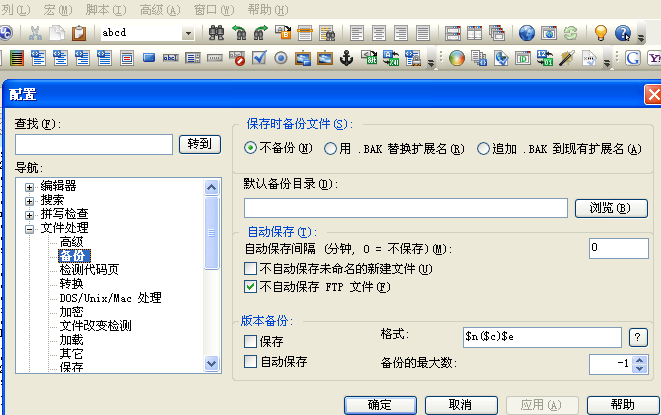 UltraEdit去掉.bak备份文件 UltraEdit很好用,一般查看.java、,.jsp文件我都喜欢使用这款软件。今天重新安装之后,明知道可以修改备份文件.bak的,但是就是没有找到位置。记性真的很不好。还是记录下吧,不知道什么时候会用到。一般是在:高级--配置--文件处理--备份,修改为“不备份”就可以了。