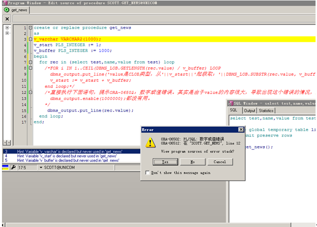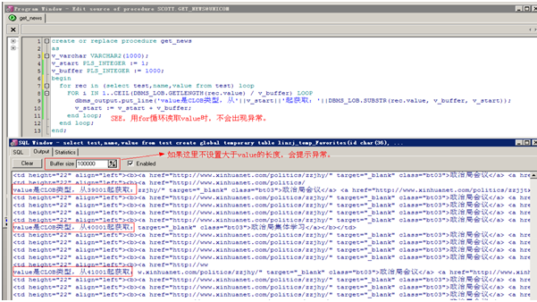 create or replace procedure get_newsas v_varchar VARCHAR2(1000); v_start PLS_INTEGER := 1; v_buffer PLS_INTEGER := 1000;begin dbms_output.enable(1000000); for rec in (select test,name,value from test) loop FOR i IN 1..CEIL(DBMS_LOB.GETLENGTH(rec.value) / v_buffer) LOOP dbms_output.put_line('value是CLOB类型,从'||v_start||'起获取:'||DBMS_LOB.SUBSTR(rec.value, v_buffer, v_start)); v_start := v_start + v_buffer; end loop; end loop; end;
