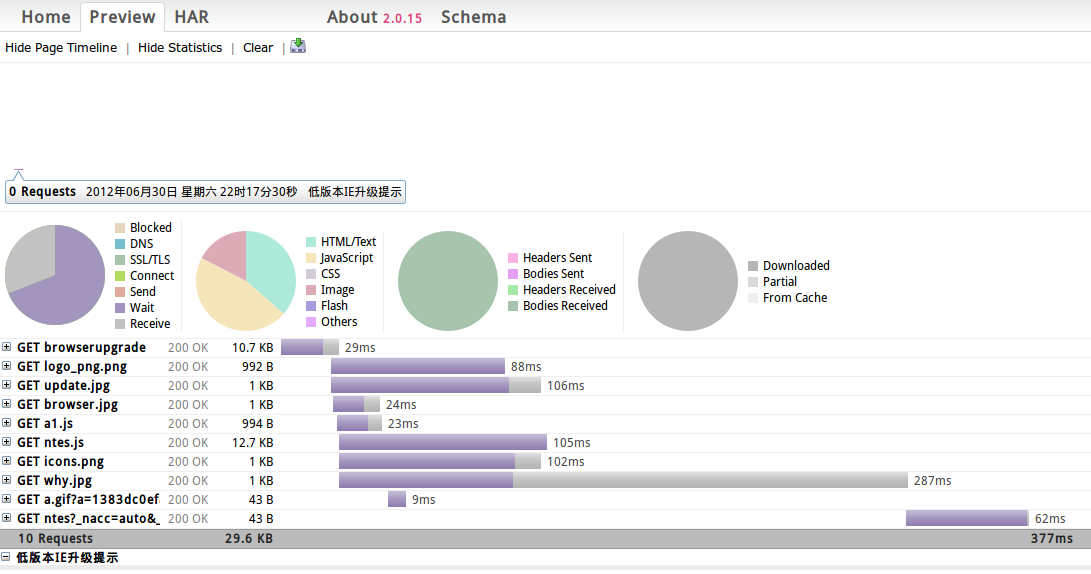 将生成的json格式报告放到HAR viewer( http://www.softwareishard.com/har/viewer/ )中,便可轻松得到资源加载瀑布图: