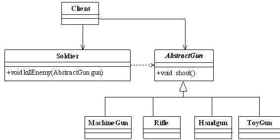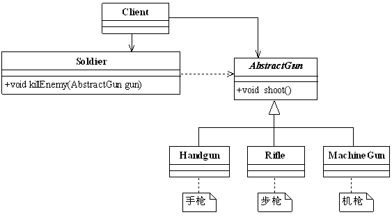 枪的主要职责是射击,如何射击在各个具体的子类中定义。注意在类中调用其他类时务必调用父类或接口,如果不能掉话父类或接口,说明类的射击已经违反了LSP原则。