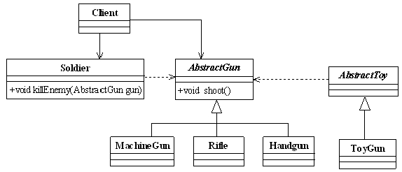 玩具枪是不能用来射击的,杀不死人的,这个不应该写shoot方法,在这种情况下业务的调用类就会出现问题。为了解决这个问题,ToyGun可以脱离继承,建立一个独立的父类,为了做到代码可以服用,可以与AbstractGun建立关联委托关系,如下图: