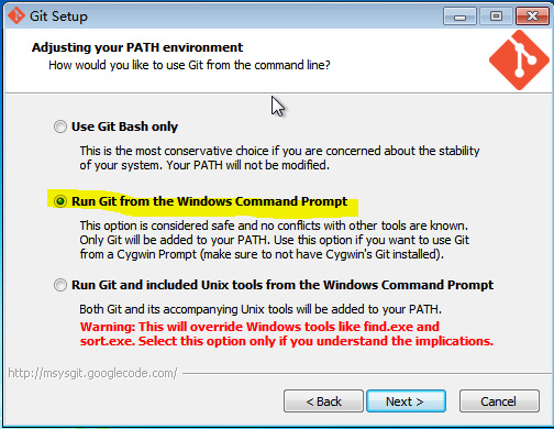 到 https://code.google.com/p/msysgit/downloads/list?q=full+installer+official+git 下载一个最新的程序,比如我下载的是 Git-1.8.4-preview20130916.exe,安装时在下图所示步骤里,选择“Run Git from the Windows Command Prompt”,将git添加到PATH路径中,其他都选默认值。