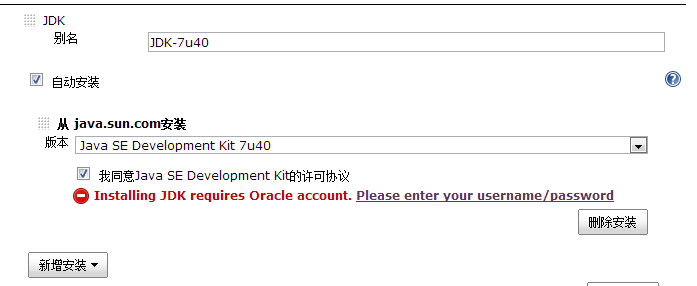 我们选择让Jenkins系统在需要的时候自动安装“Java SE Development Kit 7u40”。