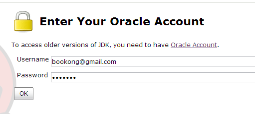 注意最下面的错误提示,需要你输入一个Oracle 帐号,点击链接进去,是一个需要输入帐号和密码的页面(帐号可以到 https://login.oracle.com/mysso/signon.jsp 免费注册)。
