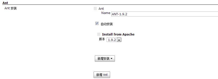 设置好JDK后,我们找到“Ant”部分,点击“新增Ant”按钮。也同样设置在构建需要时自动安装Ant。