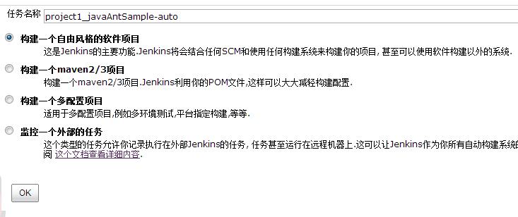 现在回到Jenkins的首页,点击“新Job”。使用Ant编译的话我们要选择“构建一个自由风格的软件项目”;“任务名称”我写的是“project1_javaAntSample-auto”,这个名字里我想表达说这个Job属于“project1”项目,之后我建立视图时会用正则匹配所有以“project1_”开头的项目;后面的“javaAntSample”希望我直接查看操作目录时有比较直观的提示,我希望用最后的“auto”标明这是一个做监控检查的Job。当然你也可以采用其他的命名规则。