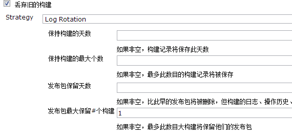 下面的“丢弃旧的构建”很重要,我们曾经遇到过使用的太久后无用的发布包(比如WAR包)将磁盘空间耗尽的情况。我建议这里设置“发布包最大保留#个构建”设置为1。