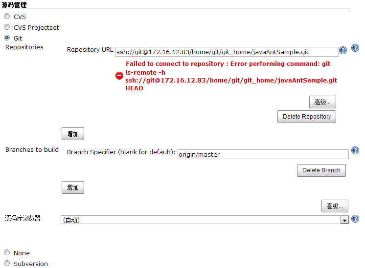 下面就到了“源码管理”这部分了,选择“Git”,填写仓库的URL和希望签出的分支名。