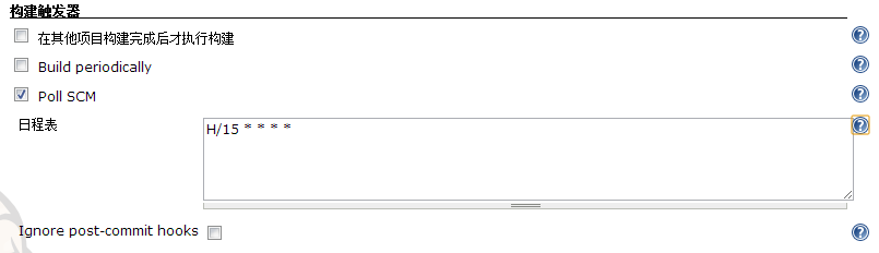 下面的“构建触发器”部分,我们希望是每15分钟检查一次代码库,如果有变化,则触发构建。