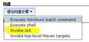 在下面的“构建”部分,点击按钮“增加构建步骤”,选择“Invoke Ant”。