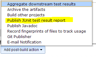 在下面的“构建后操作”中,点击“Add post-build action”按钮,在列表中选择“Publish JUnit test result report”。