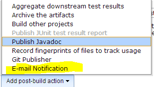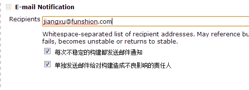 现在再次点击“Add post-build action”按钮,选择“E-mail Notification”,添加失败后的邮件提醒。这里不但可以设定固定通知的人,还可以自动发邮件给疑似导致构建失败的人。