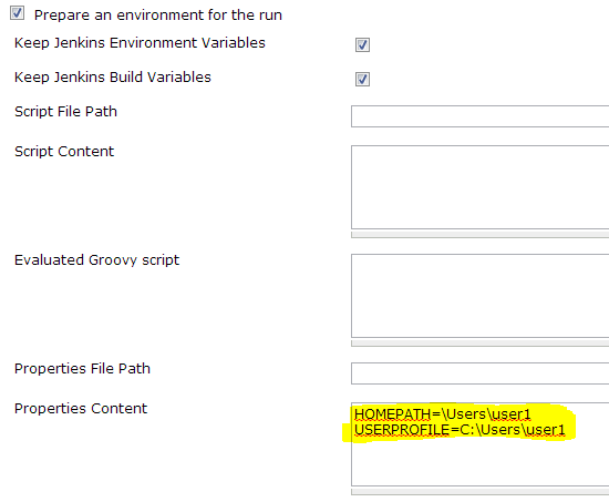 这时再修改Job的定义(在“参数化构建过程”下面会出现新的属性“Prepare an environment for the run”。设置里面的“Properties Content”
