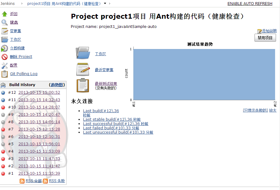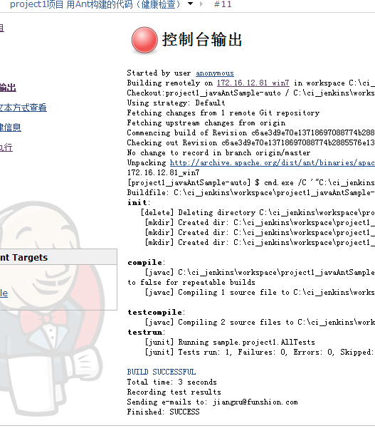 然后我们写个简单的,用Ant编译的Java小程序,javaAntSample 推送到之前搭建好的git服务器上(具体方法参考前面关于git服务器部分的说明)。在这个程序的 build.xml 里,我们主要想执行 testrun 这个 target,它会完成编译并执行单元测试的工作,最后在项目根路径下产JUnit单元测试的报告 TEST-sample.project1.AllTests.xml。