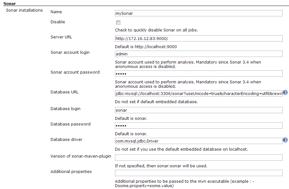 再向下,找到“Sonar”部分,点击“Add Sonar”按钮。其中“Server URL”就是我们Sonar的访问URL“http://172.16.12.83:9000/”;Sonar默认帐号和密码都是“admin”;数据库部分的设置就是我们前面配置Sonar配置文件中写的MySQL相关设置。