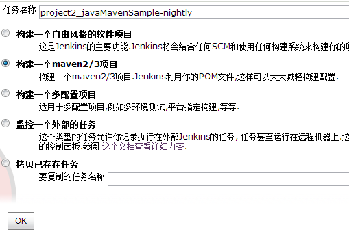 现在创建一个新Job,名称就叫“project2_javaMavenSample-nightly”,类型选择“构建一个maven2/3项目”