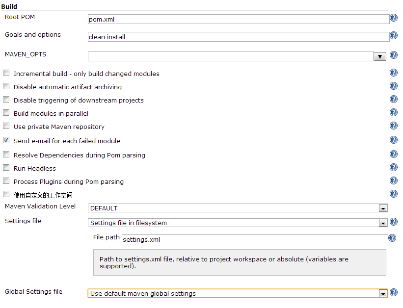 Maven项目的Job会有一个“Build”部分。“Goals and options”我们写“clean install”,点击“高级”按钮展开高级属性,在“Settings file”这里,选择“Settings file in filesystem”,“File path”上可以写相对于Job工作区的相对路径,这里我们直接写“settings.xml”,这样代码库中随项目一起提交的settings.xml就会生效。