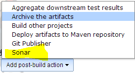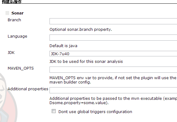 在“构建后操作”这部分,点击“Add post-build action”按钮,添加“Sonar”,基本上安装默认值就可以。