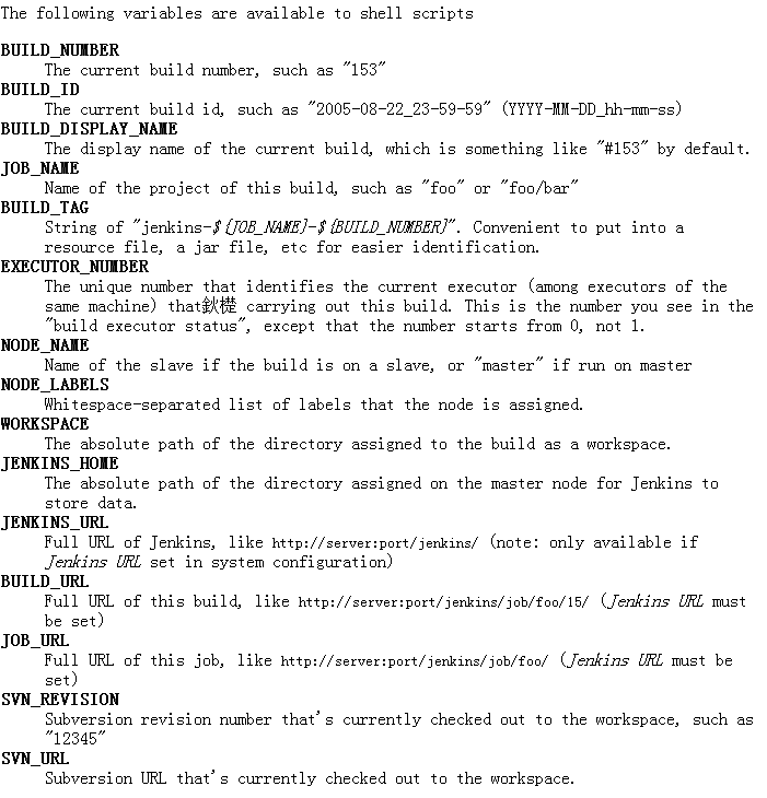 写脚本时,有写Jenkins的内部变量你可以使用,比如我们这个实验系统,有个页面就是介绍这些内部变量的 http://ci.abc.com/jenkins/env-vars.html/。