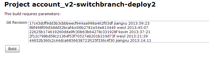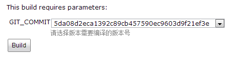 我们欣赏一下在主节点构建的Job使用Git参数做参数化构建的效果。有一点要注意,这里虽然列出提交Id但不代表选择后会签出指定的这次提交代码,它只是将你选择的内容保存到你指定Name命名的环境变量里。