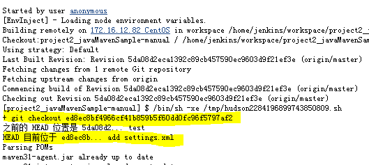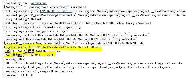 当选择最早的那次提交 2f65720bb717c4e62ae9d2e34d521689e30cd463 时,执行结果如下,构建失败的原因参考上面的提交历史可知,那次提交时 settings.xml 文件还未添加。