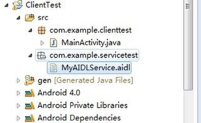 ClientTest中的Activity如果想要和MyService建立关联其实也不难,首先需要将MyAIDLService.aidl文件从ServiceTest项目中拷贝过来,注意要将原有的包路径一起拷贝过来,完成后项目的结构如下图所示: