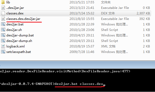 3.2打开DOS命令行,进入dex2jar所在目录,运行 dex2jar.bat    classes.dex 生成 classes_dex2jar.jar