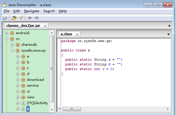 4.最后用jd-gui.exe打开生成的classes_dex2jar.jar我们就能开到应用的源代码了。