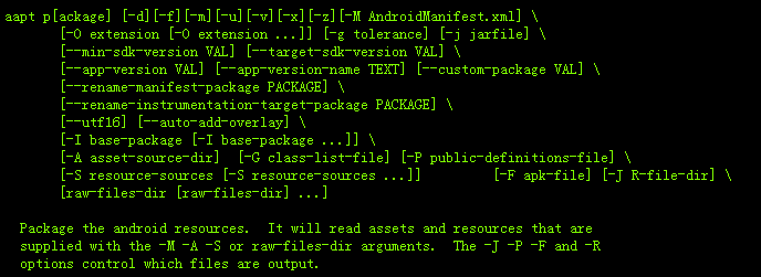 5使用Android SDK提供的aapt.exe生成资源包文件(包括res、assets、androidmanifest.xml等):