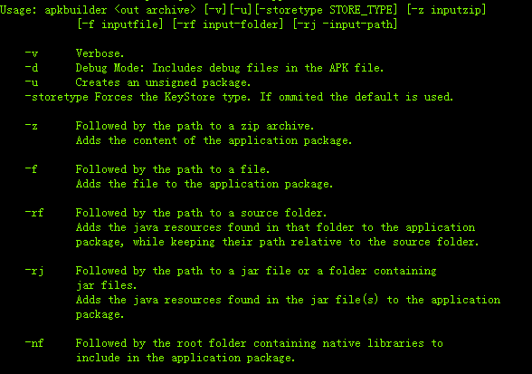 apkbuilder ${output.apk.file} -u -z ${packagedresource.file} -f ${dex.file} -rf ${source.dir} -rj ${libraries.dir}