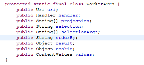 3.AsycQueryHandler中有一个WorkerArgs内部类,保存着一些数据。