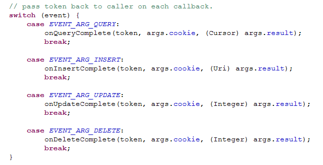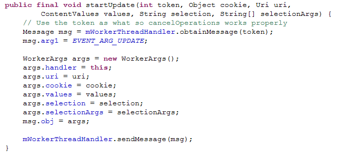 子类在实现自己的handlerMessage()方法时,调用super.handleMessage(Message)时,应注意Message中的obj参数可以向下转化为WorkerArgs对象。AsycQueryHandler的startXXXX()方法使用WorkArgs对象来传递执行所需要的参数,并把WorkArgs对象赋给Message.obj。Message中的arg1中保存着要进行的操作,AsycQueryHandler中有四个静态的实例域代表四种操作。