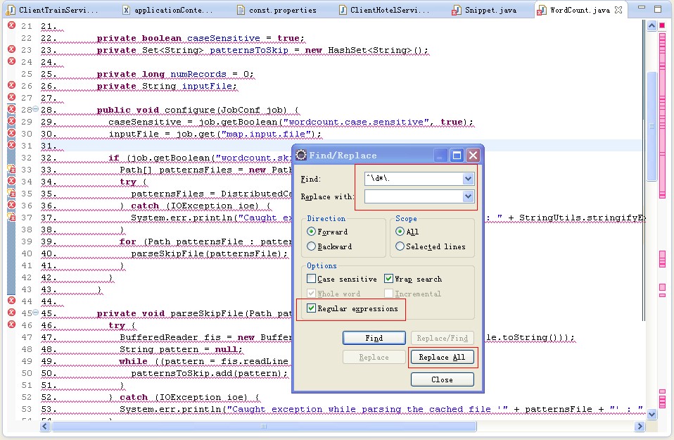 去掉java文件行号 只需要在编辑器里打开替换的对话框,输入^\d*\. 然后选择Regular expressions(正则表达式),点击Replace ALL(替换全部)。搞定,打完收工!例如eclipse中,如图: