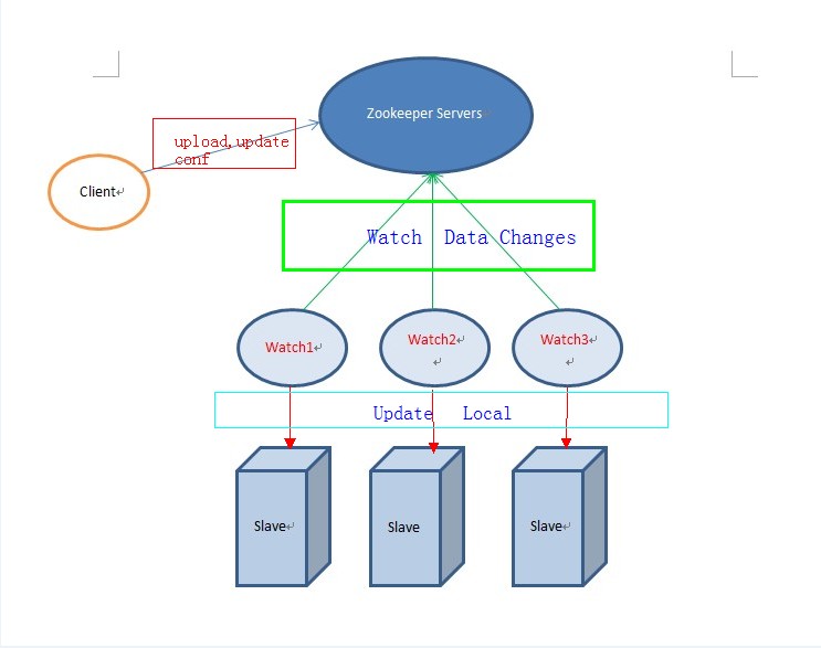事实上,利用Zookeeper,就能够很容易的,高可靠的帮我们完成这件事,我们只需要把配置文件保存在Zookeeper的znode里,然后通过Watch来监听数据变化,进而帮我们实现同步。一个简单的工作图如下所示: