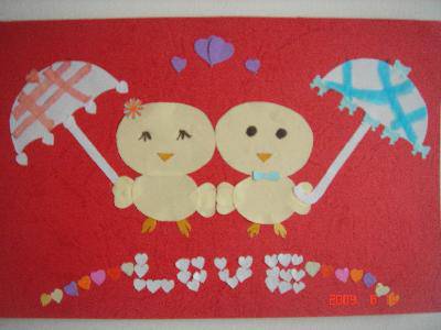 今天,我做了一张叫“爱”的贺卡。底儿是红色的卡纸。用黄色的卡纸剪出椭圆形小鸡的头和身子,头大身子小。再用黄色卡纸剪出两个爱心当翅膀。粘到身体的两侧。给男小鸡系好领带,给女小鸡带上头花。剪两把雨伞,一把是爱心铃铛雨伞,另一把是蝴蝶铃铛雨伞,在爱心铃铛雨伞上画上“横竖”的粉色花纹,在蝴蝶铃铛雨伞上,画上“斜”的蓝色花纹,然后,女小鸡拿着爱心铃铛雨伞,男小鸡拿着蝴蝶铃铛雨伞。最后给女小鸡画上眯成一条缝的眼睛,给男小鸡画上一双水灵灵的大眼睛。再给它们贴上金黄色的嘴巴和脚。